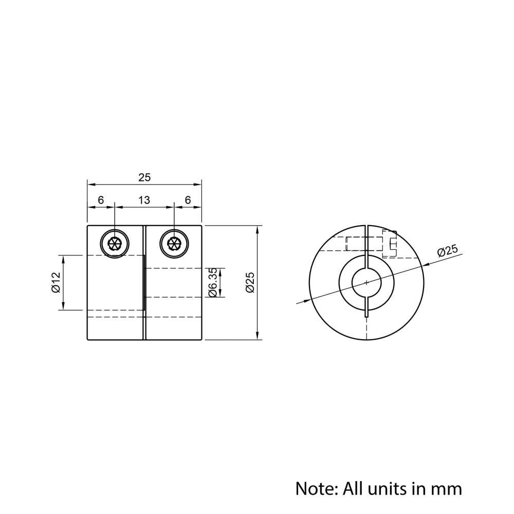 1/4″x12mm Rigid Shaft Coupling is a solid, precision-machined coupling designed to connect two shafts with exact alignment and no flexibility. Ideal for high-torque, high-precision applications, it offers zero backlash and maximum torsional stiffness for direct power transfer. Its compact, simple design ensures easy installation and low maintenance in systems where shaft alignment is perfectly controlled, making it suitable for tight tolerance assemblies. While it offers no misalignment tolerance and transmits vibration, it remains a popular choice for many motion control systems.