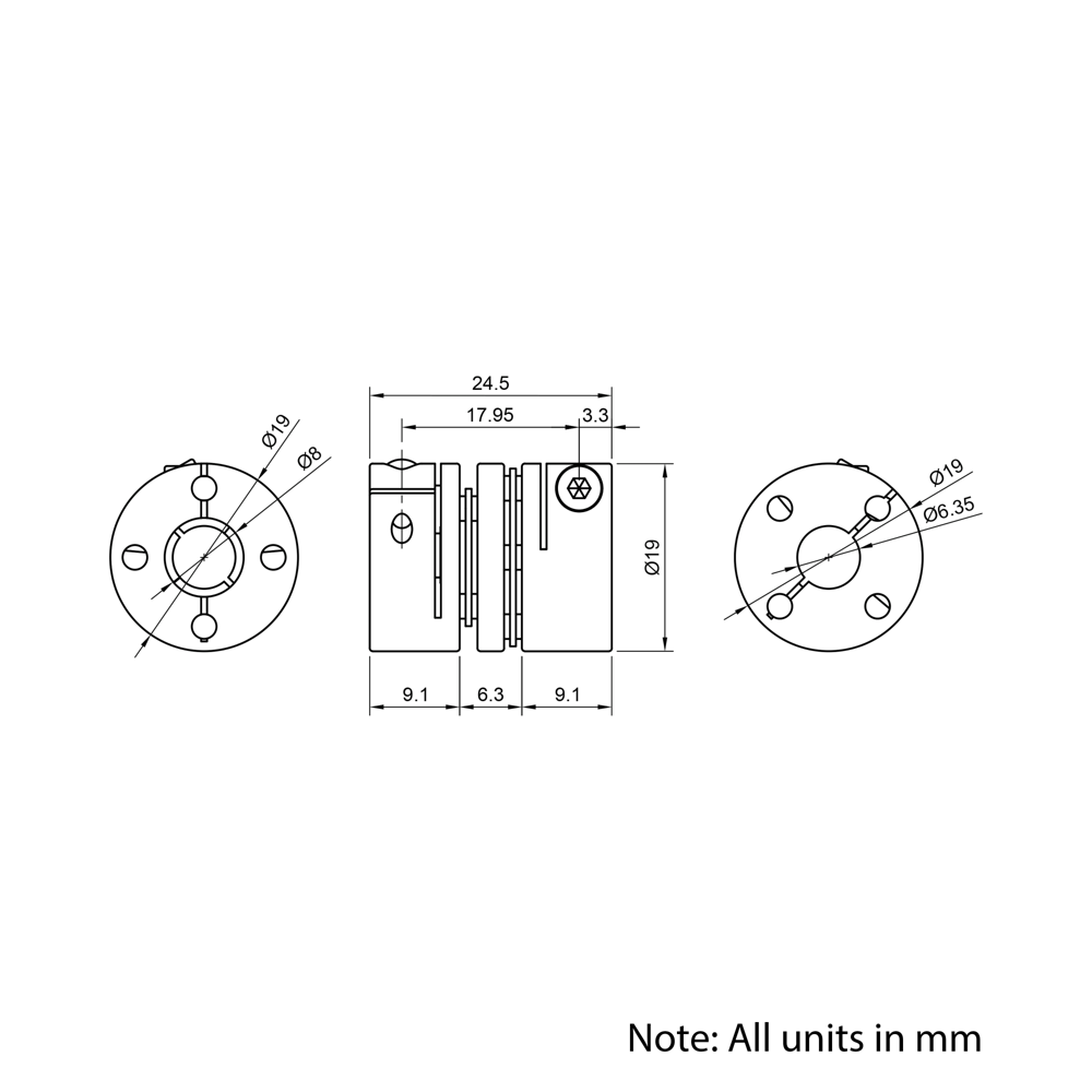 1/4″x8mm Disc Flexible Shaft Coupling is a high-performance coupling designed to connect shafts while delivering precise, zero-backlash torque transmission. Ideal for high-precision motion control applications, this coupling features rigid metal discs that provide high torsional stiffness. Its disc design accommodates shaft misalignment while maintaining consistent torque transfer, making it suitable for applications where precision is critical. While it offers low to medium torque capacity and limited vibration damping, its stiffness, accuracy, and zero-backlash performance make it a popular choice for many motion control systems.