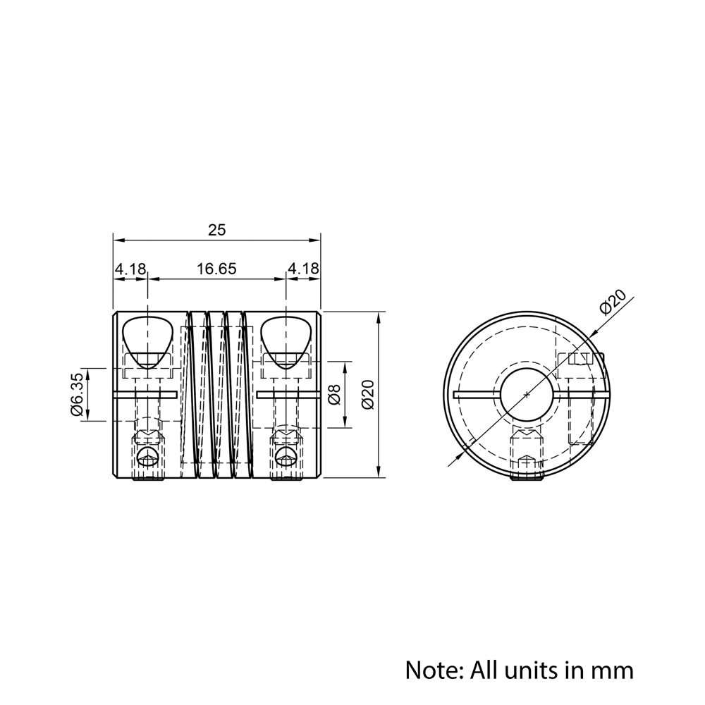 1/4″x8mm Helical Beam Flexible Shaft Coupling is a precision-machined, single-piece coupling designed to connect shafts while compensating for misalignment. Ideal for cost-effective light to medium-duty applications, this coupling uses a helical cut design that accommodates radial and angular misalignments while also providing some vibration damping. Easy to install and maintain, it is commonly used in stepper motor and encoder setups where flexibility and simplicity are important. While it has low to medium torque capacity and low torsional stiffness, its misalignment tolerance and economical design make it a popular choice for many motion control systems.