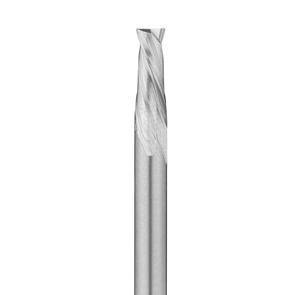 This one cuts with a downward spiral, but (unlike the 1/4″ one) is much more useful for 1/8″ cuts.