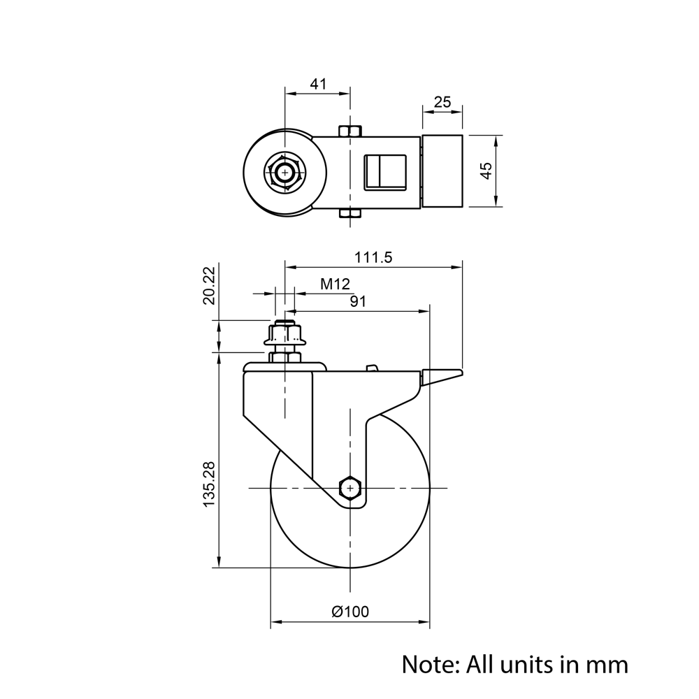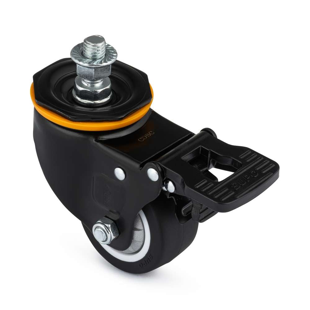 100mm Braked Swivel Stud Castor with polyurethane wheel is designed to provide smooth, reliable mobility for aluminium extrusion assemblies. With a steel frame and a high-grip polyurethane wheel, this castor offers durability and vibration absorption across a variety of surfaces. The swivel design allows for full 360° rotation, while the integrated brake locks the wheel, providing stability when stationary. Perfect for carts, mobile workstations, and machine bases that require both mobility and secure positioning.