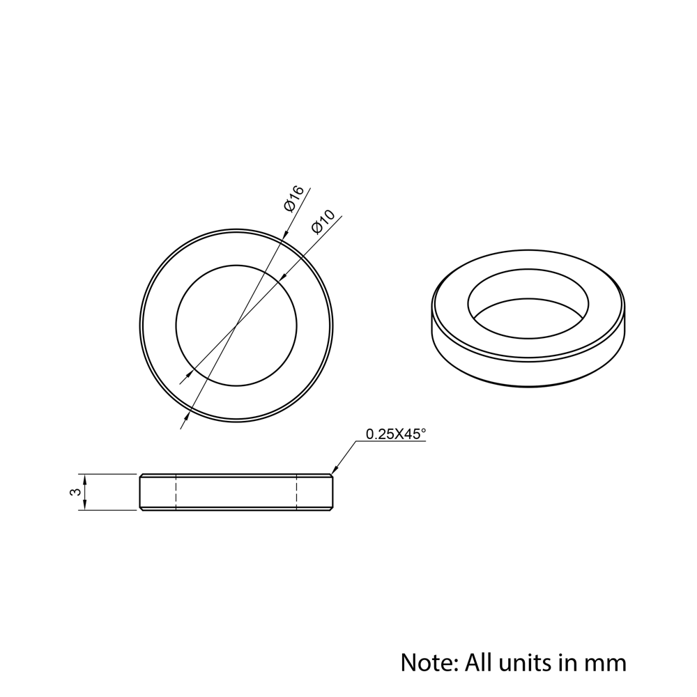 10x16x3mm Aluminium Spacers are precision-engineered components designed to the same DIN988 standard dimensions as our precision shims. Perfect for use in aluminium extrusion systems, these spacers provide reliable separation and support for mounting stepper motors, spacing pulleys, wheels, and other components. Made from lightweight, corrosion-resistant aluminium, they ensure optimal stability and accurate alignment in custom assemblies.