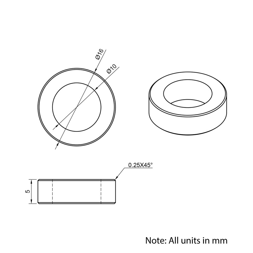 10x16x5mm Aluminium Spacers are precision-engineered components designed to the same DIN988 standard dimensions as our precision shims. Perfect for use in aluminium extrusion systems, these spacers provide reliable separation and support for mounting stepper motors, spacing pulleys, wheels, and other components. Made from lightweight, corrosion-resistant aluminium, they ensure optimal stability and accurate alignment in custom assemblies.