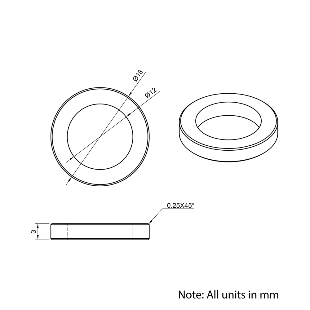 12x18x3mm Aluminium Spacers are precision-engineered components designed to the same DIN988 standard dimensions as our precision shims. Perfect for use in aluminium extrusion systems, these spacers provide reliable separation and support for mounting stepper motors, spacing pulleys, wheels, and other components. Made from lightweight, corrosion-resistant aluminium, they ensure optimal stability and accurate alignment in custom assemblies.