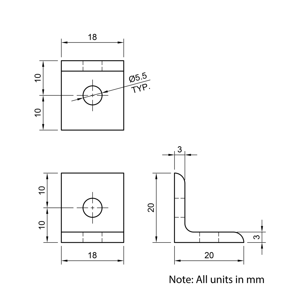20×20 20 Series Universal Corner Brackets provide a strong and flexible solution for creating secure 90-degree joints in aluminium extrusion assemblies. Designed for high shear and moment resistance, these brackets offer high structural integrity of frameworks without requiring any machining. Their universal design allows them to be mounted either parallel or perpendicular to the extrusion slot, and they do not have to be used solely for extrusion-to-extrusion connections. This versatility makes them ideal for a wide range of applications, from machine enclosures to industrial workstations, ensuring a reliable and durable connection.
