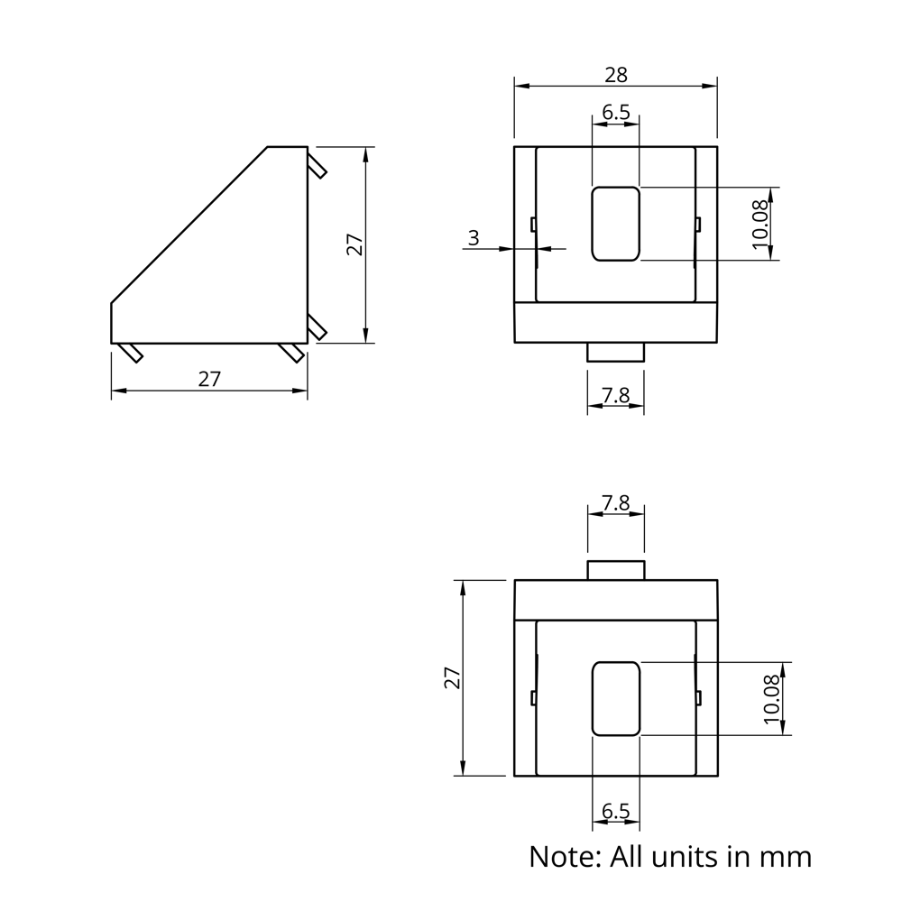 Corner Brackets are designed for use with 30 Series T-Slot Aluminium Extrusions to create strong and stable 90-degree connections. These brackets offer excellent shear, moment and torsional resistance, making them suitable for high-strength structural frameworks, machine enclosures, and modular assemblies. Their adaptability ensures a reliable connection in various configurations while maintaining ease of assembly and long-term durability. The included cover cap not only improves aesthetics but also helps maintain a cleaner assembly, making these brackets particularly suitable for applications where hygiene and appearance matter.