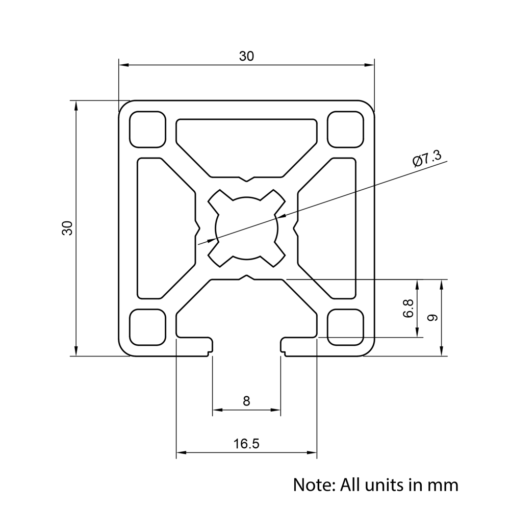 1 Slot 30x30mm 30 Series T-Slot Aluminium Extrusion Profile is the perfect solution for your next project. Designed with versatility and durability in mind, our high-quality T-Slot compatible aluminium profile is ideal for a wide range of applications. From framing systems to machine guarding, workstations to display stands, as well as CNC machines and 3D printers, this reliable and easy-to-assemble extrusion provides a strong foundation for any build. Use the potential of our 30×30 1 Slot aluminium extrusion for your industrial applications, products and automated systems.