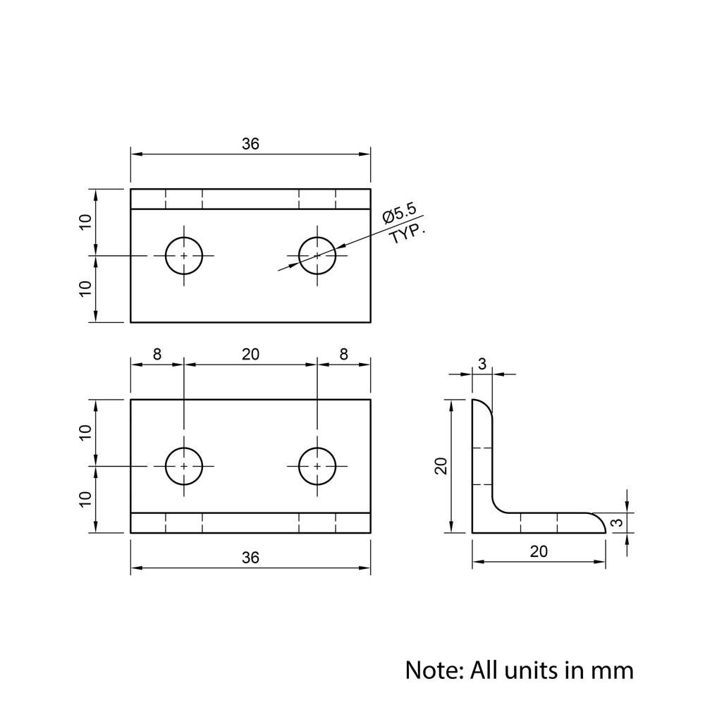 40×20 20 Series Universal Corner Brackets provide a strong and flexible solution for creating secure 90-degree joints in aluminium extrusion assemblies. Designed for high shear and moment resistance, these brackets offer high structural integrity of frameworks without requiring any machining. Their universal design allows them to be mounted either parallel or perpendicular to the extrusion slot, and they do not have to be used solely for extrusion-to-extrusion connections. This versatility makes them ideal for a wide range of applications, from machine enclosures to industrial workstations, ensuring a reliable and durable connection.