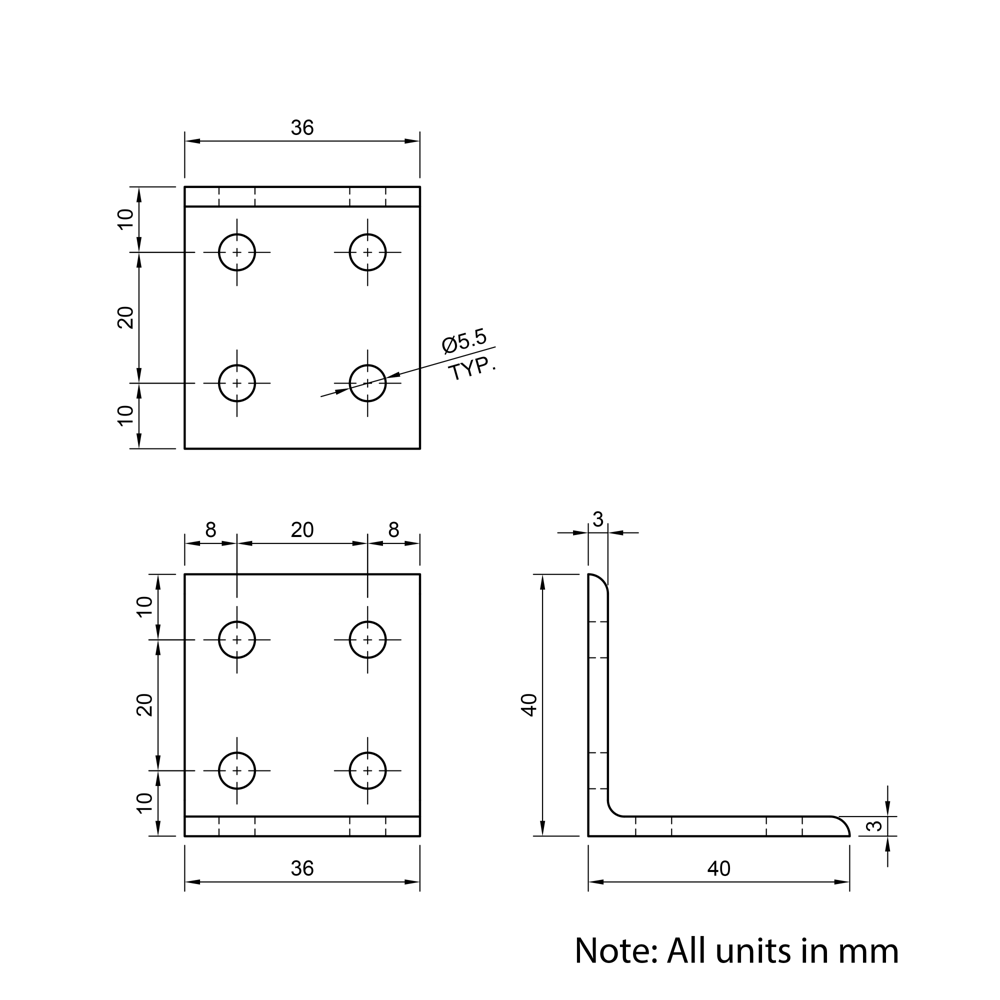 40×40 20 Series Universal Corner Brackets provide a strong and flexible solution for creating secure 90-degree joints in aluminium extrusion assemblies. Designed for high shear and moment resistance, these brackets offer high structural integrity of frameworks without requiring any machining. Their universal design allows them to be mounted either parallel or perpendicular to the extrusion slot, and they do not have to be used solely for extrusion-to-extrusion connections. This versatility makes them ideal for a wide range of applications, from machine enclosures to industrial workstations, ensuring a reliable and durable connection.