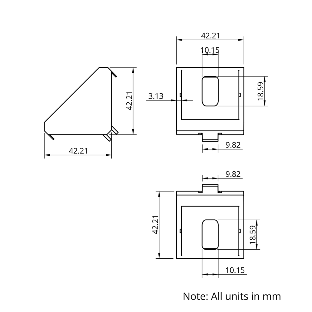 Corner Brackets are designed for use with 45 Series T-Slot Aluminium Extrusions to create strong and stable 90-degree connections. These brackets offer excellent shear, moment and torsional resistance, making them suitable for high-strength structural frameworks, machine enclosures, and modular assemblies. Their adaptability ensures a reliable connection in various configurations while maintaining ease of assembly and long-term durability. The included cover cap not only improves aesthetics but also helps maintain a cleaner assembly, making these brackets particularly suitable for applications where hygiene and appearance matter.