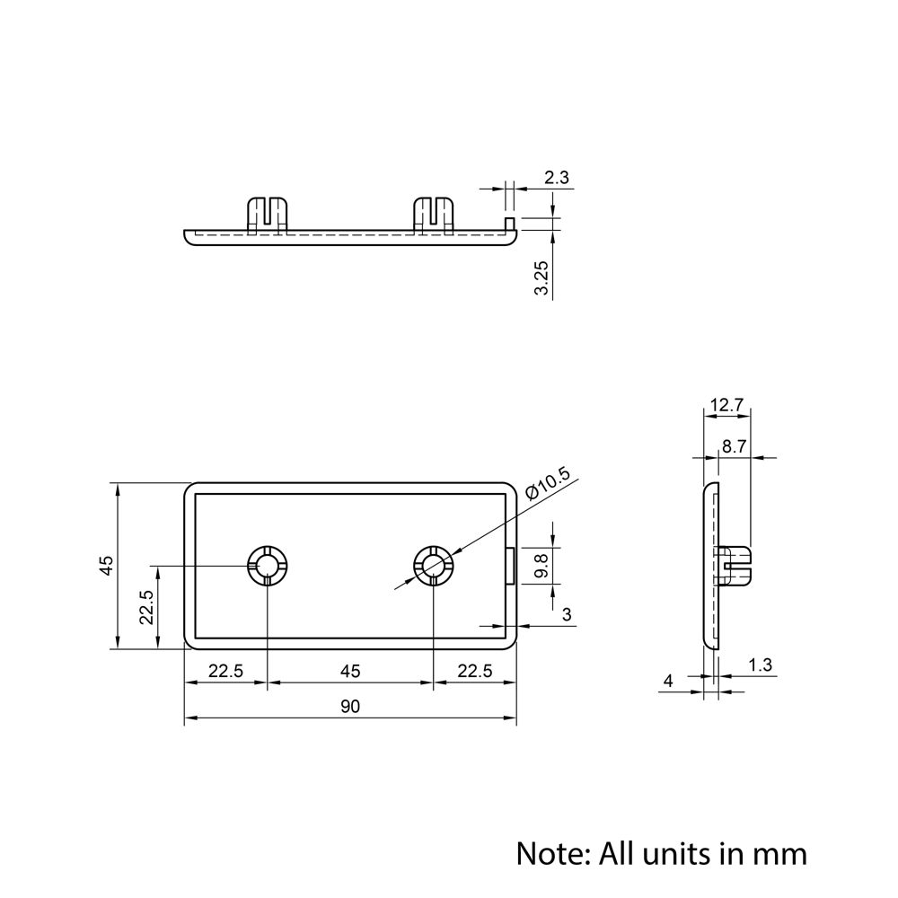 45×90 45 Series Plastic End Cap are designed to push directly onto the ends of aluminium extrusion profiles, providing a clean, protective, and functional finish. Made from durable Nylon, these end caps enhance the appearance of your assemblies while protecting the extrusion ends from damage and wear. They also help prevent injuries by covering sharp edges, making them an essential addition to any aluminium extrusion based project. Installation is simple — just push into place, a light tap with a rubber mallet may be required.