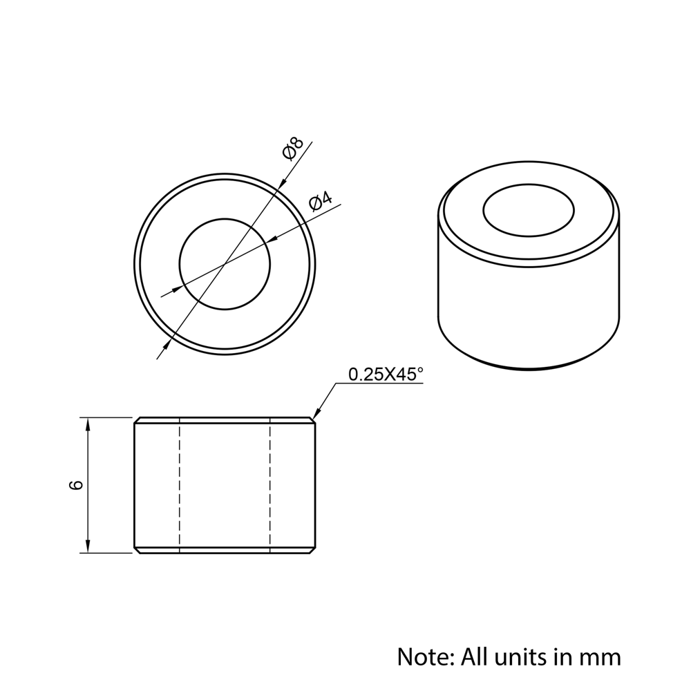4x8x6mm Aluminium Spacers are precision-engineered components designed to the same DIN988 standard dimensions as our precision shims. Perfect for use in aluminium extrusion systems, these spacers provide reliable separation and support for mounting stepper motors, spacing pulleys, wheels, and other components. Made from lightweight, corrosion-resistant aluminium, they ensure optimal stability and accurate alignment in custom assemblies.