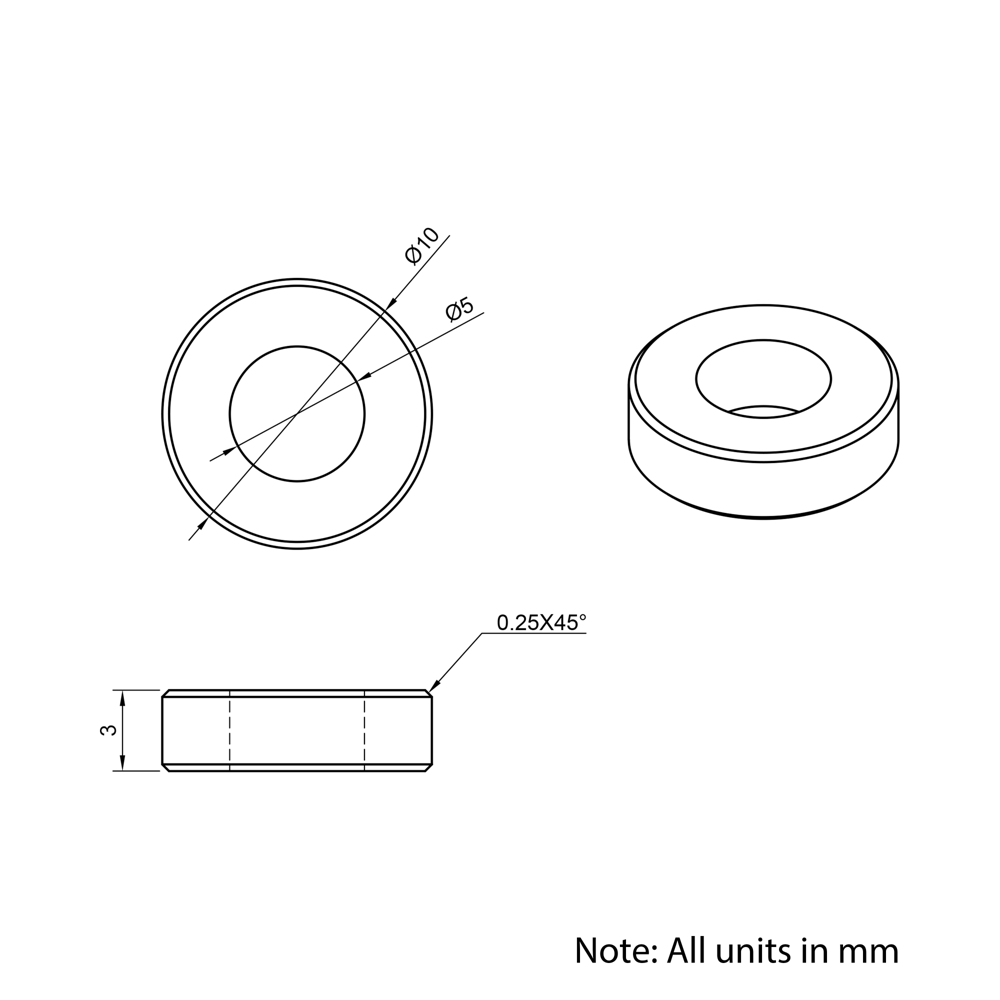5x10x3mm Aluminium Spacers are precision-engineered components designed to the same DIN988 standard dimensions as our precision shims. Perfect for use in aluminium extrusion systems, these spacers provide reliable separation and support for mounting stepper motors, spacing pulleys, wheels, and other components. Made from lightweight, corrosion-resistant aluminium, they ensure optimal stability and accurate alignment in custom assemblies.