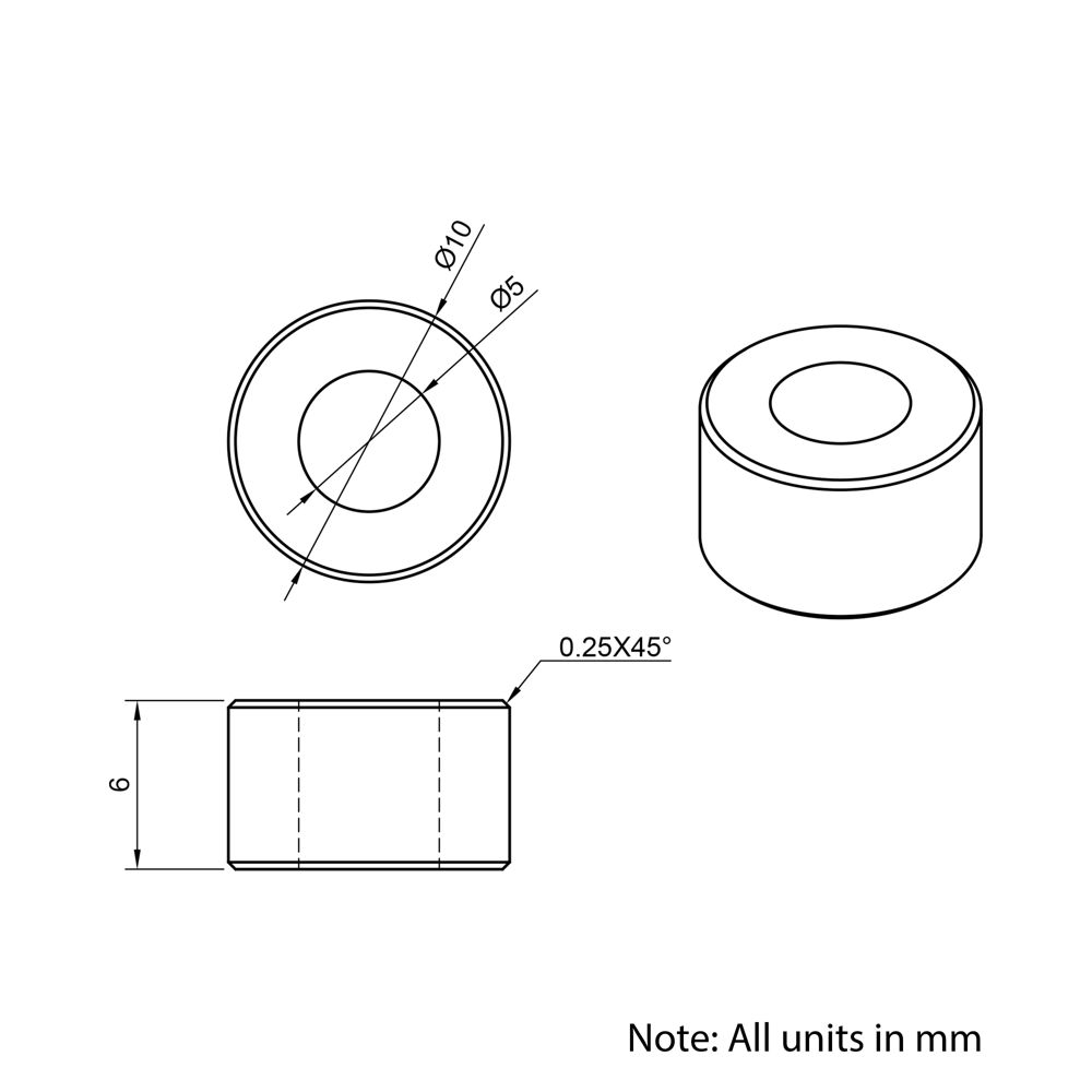 5x10x6mm Aluminium Spacers are precision-engineered components designed to the same DIN988 standard dimensions as our precision shims. Perfect for use in aluminium extrusion systems, these spacers provide reliable separation and support for mounting stepper motors, spacing pulleys, wheels, and other components. Made from lightweight, corrosion-resistant aluminium, they ensure optimal stability and accurate alignment in custom assemblies.