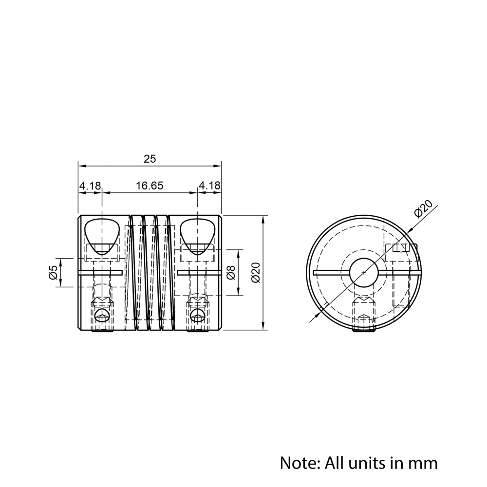 5x8mm Helical Beam Flexible Shaft Coupling is a precision-machined, single-piece coupling designed to connect shafts while compensating for misalignment. Ideal for cost-effective light to medium-duty applications, this coupling uses a helical cut design that accommodates radial and angular misalignments while also providing some vibration damping. Easy to install and maintain, it is commonly used in stepper motor and encoder setups where flexibility and simplicity are important. While it has low to medium torque capacity and low torsional stiffness, its misalignment tolerance and economical design make it a popular choice for many motion control systems.