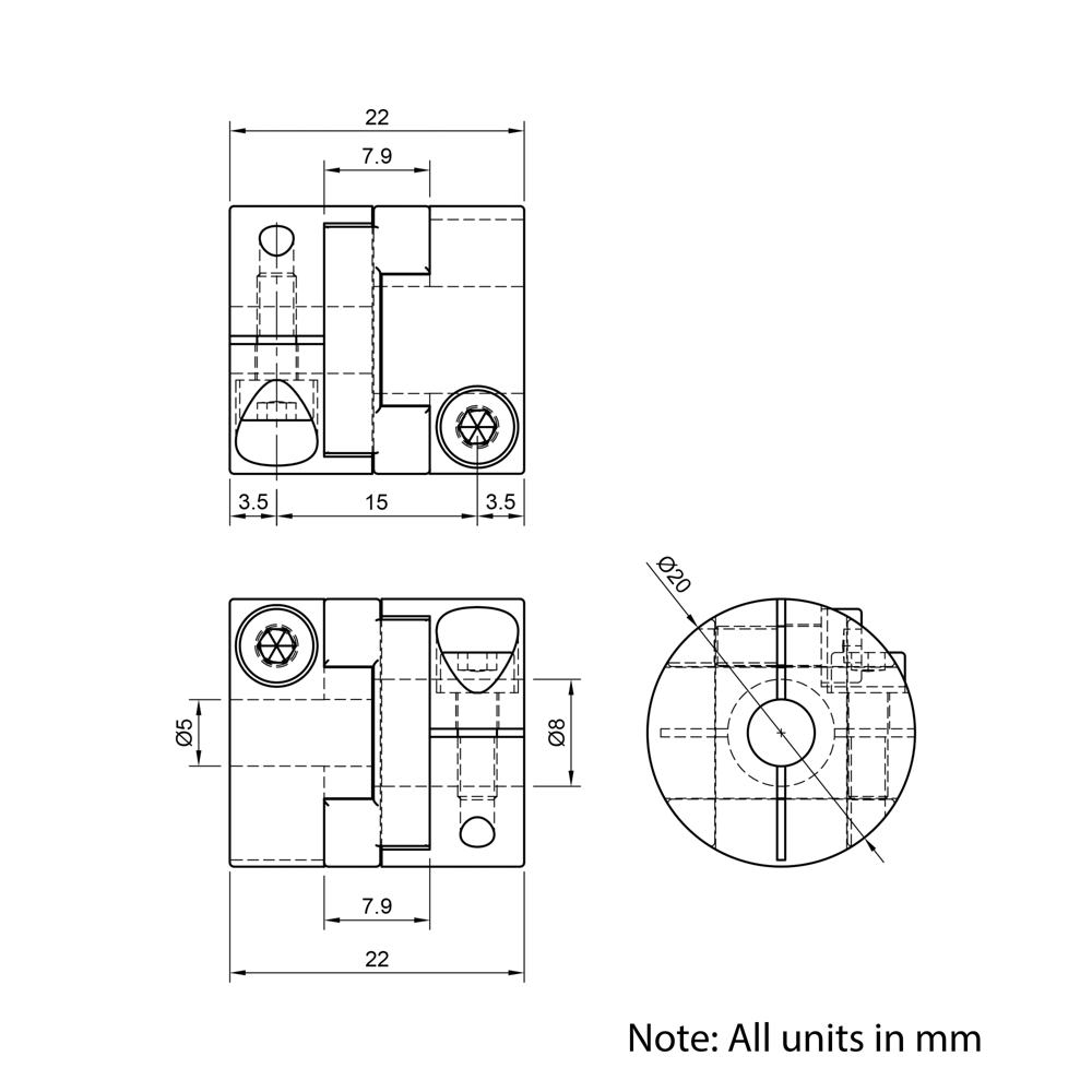 5x8mm Oldham Flexible Shaft Coupling is a three-piece coupling designed to connect shafts while offering excellent radial misalignment compensation and good vibration damping. Ideal for medium torque general-purpose applications, this coupling features a plastic centre disc that provides electrical isolation and absorbs shock for quieter operation. Its Oldham design enables smooth torque transmission with minimal stress on connected shafts, making it suitable for systems where radial misalignment is a concern. While it has low angular misalignment tolerance and low torsional stiffness, and the plastic disc can wear over time, its excellent misalignment handling and damping characteristics make it a popular choice for many motion control systems.