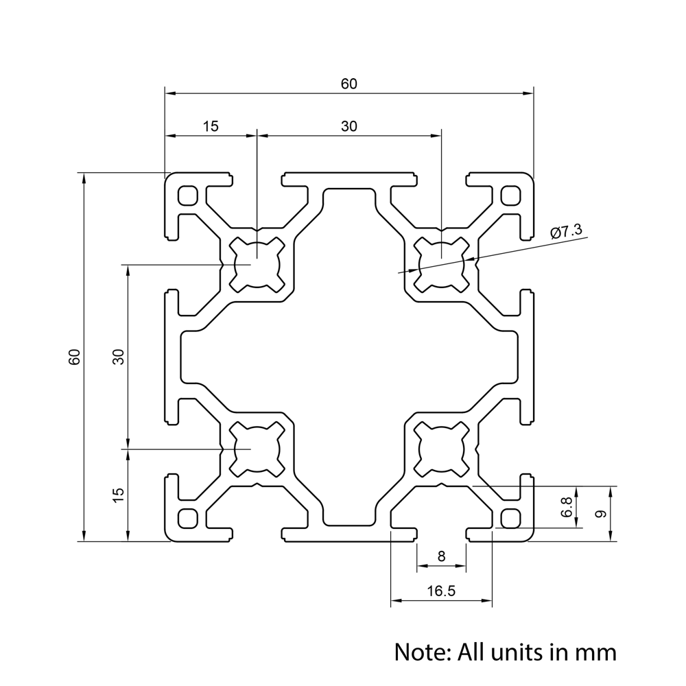60x60mm 30 Series T-Slot Aluminium Extrusion Profile is the perfect solution for your next project. Designed with versatility and durability in mind, our high-quality T-Slot compatible aluminium profile is ideal for a wide range of applications. From framing systems to machine guarding, workstations to display stands, as well as CNC machines and 3D printers, this reliable and easy-to-assemble extrusion provides a strong foundation for any build. Use the potential of our 60×60 aluminium extrusion for your industrial applications, products and automated systems.