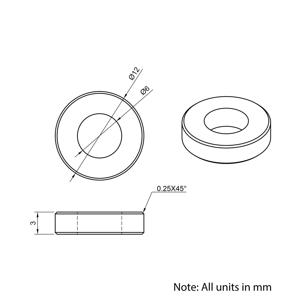 6x12x3mm Aluminium Spacers are precision-engineered components designed to the same DIN988 standard dimensions as our precision shims. Perfect for use in aluminium extrusion systems, these spacers provide reliable separation and support for mounting stepper motors, spacing pulleys, wheels, and other components. Made from lightweight, corrosion-resistant aluminium, they ensure optimal stability and accurate alignment in custom assemblies.