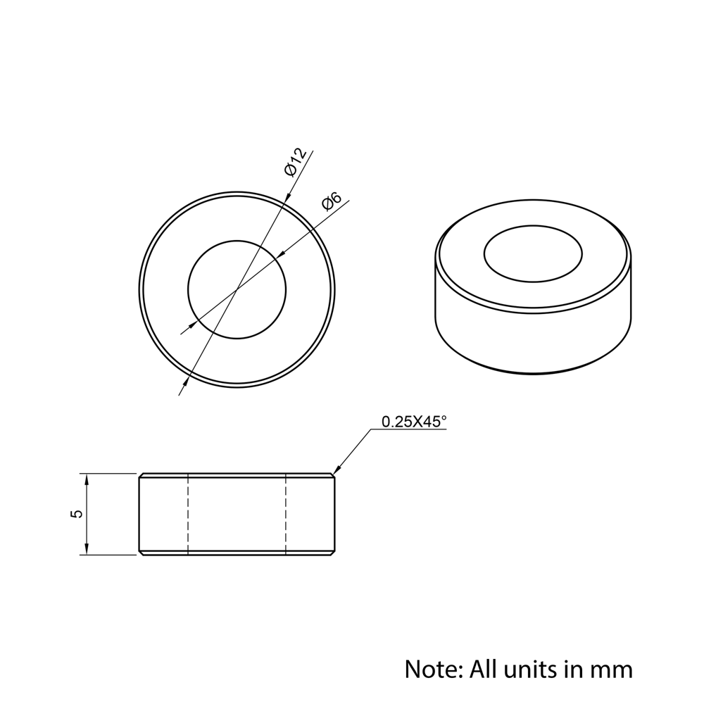 6x12x5mm Aluminium Spacers are precision-engineered components designed to the same DIN988 standard dimensions as our precision shims. Perfect for use in aluminium extrusion systems, these spacers provide reliable separation and support for mounting stepper motors, spacing pulleys, wheels, and other components. Made from lightweight, corrosion-resistant aluminium, they ensure optimal stability and accurate alignment in custom assemblies.