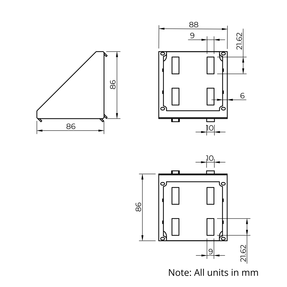 Corner Brackets are designed for use with 45 Series T-Slot Aluminium Extrusions to create strong and stable 90-degree connections. These brackets offer excellent shear, moment and torsional resistance, making them suitable for high-strength structural frameworks, machine enclosures, and modular assemblies. Their adaptability ensures a reliable connection in various configurations while maintaining ease of assembly and long-term durability. The included cover cap not only improves aesthetics but also helps maintain a cleaner assembly, making these brackets particularly suitable for applications where hygiene and appearance matter.
