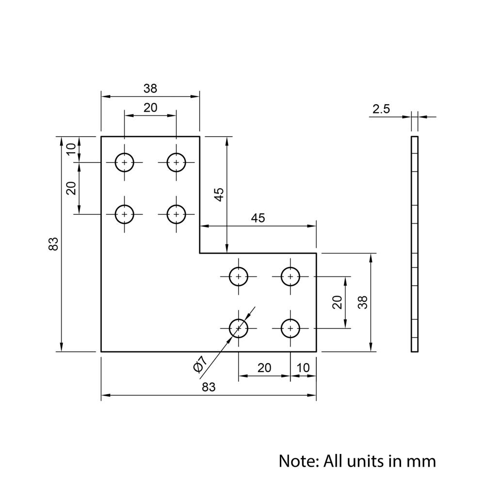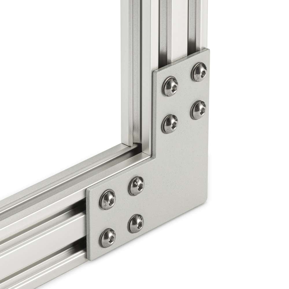 Plate Connectors are designed for use with 20 Series T-Slot Aluminium Extrusions to create strong and stable 90-degree connections. These plates offer excellent shear, moment, and torsional resistance, making them suitable for high-strength structural frameworks, machine enclosures, and modular assemblies. Their adaptability ensures a reliable connection in various configurations while maintaining ease of assembly and long-term durability. Unlike other corner brackets, they leave the internal extrusion slots completely clear, allowing for unrestricted mounting of panels, accessories, or additional structural components.