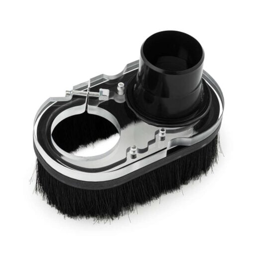 It features a two-piece design for convenience and ease of use. The top ring securely clamps around the router head and includes a 63.5mm outlet for extractor connection. The magnetically attached brush ring, fitted with 50.8mm soft nylon bristles, it can quickly de-attach allowing for convenient tool changes.