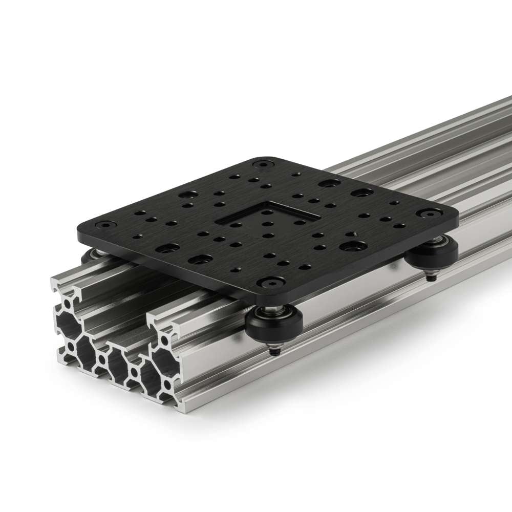 Holes on one side are designed to accept eccentric spacers, enabling preloading of the wheels for tight, wobble-free tracking. With additional hardware, it can be adapted for lead screw-driven motion. Multiple mounting holes allow for flexible attachment of tools, motors, brackets, or custom components.