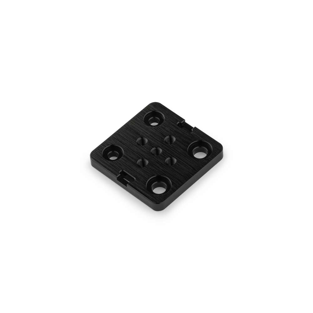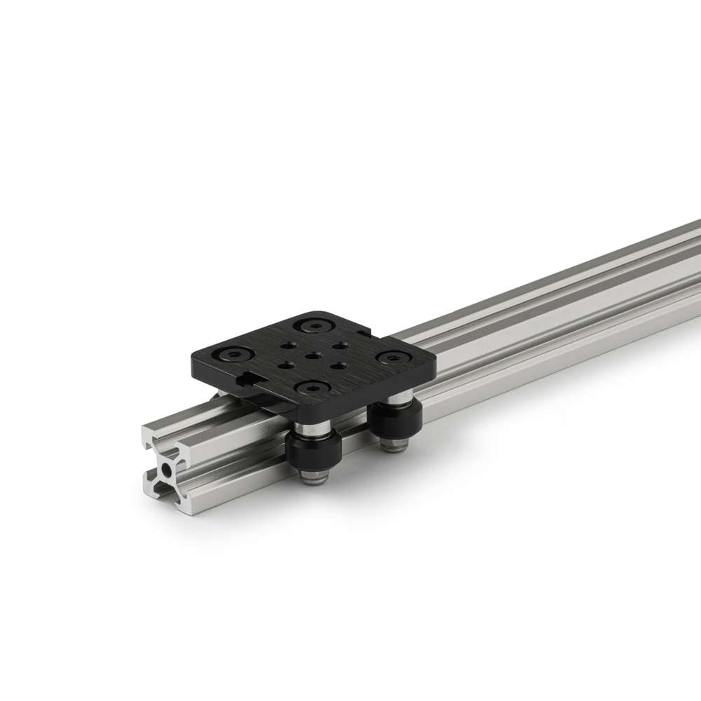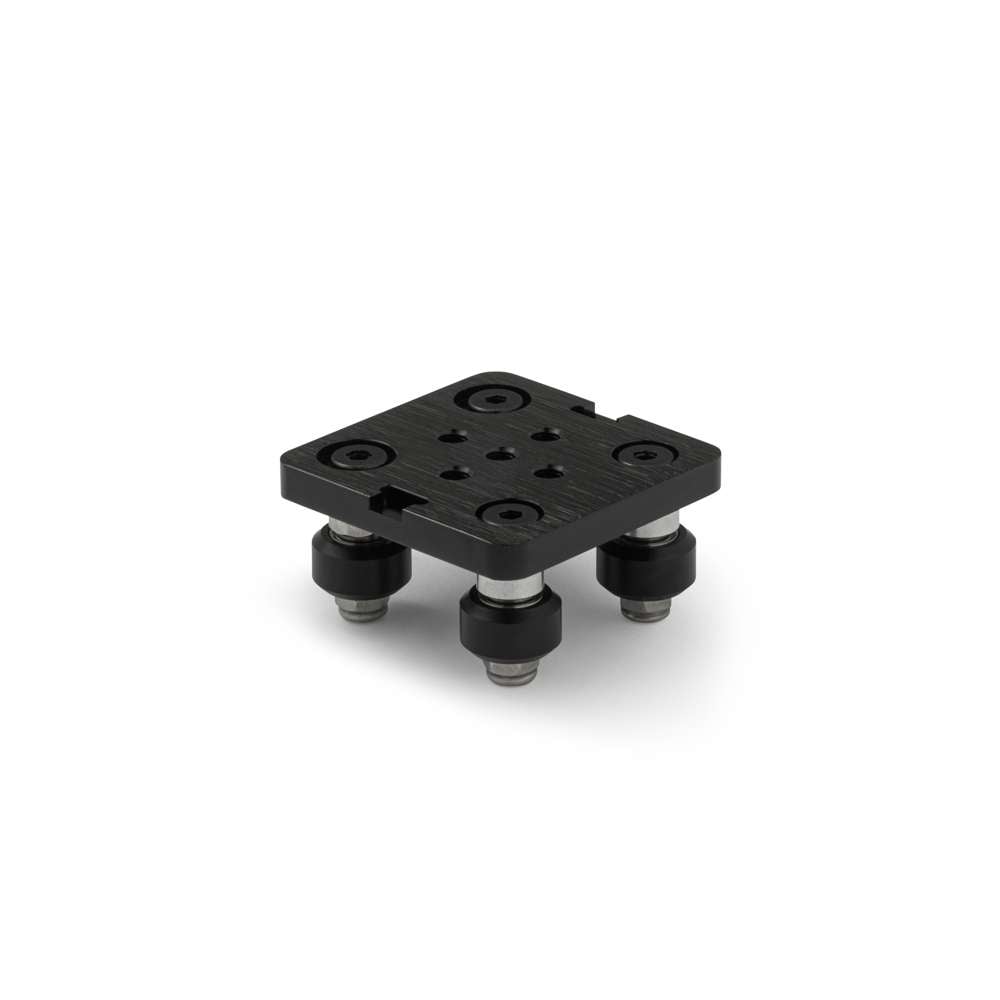 Extra Small V-Slot Gantry Plate (50x50mm) is a versatile and durable platform for building smooth, precise linear motion systems using T/V-Slot Aluminium Extrusions. Made from high-strength aluminium and finished with a black anodised coating, this plate accepts Mini V-Slot Wheels and provides a stable base that glides effortlessly along the extrusion profile. Holes on one side are designed to accept eccentric spacers, enabling preloading of the wheels for tight, wobble-free tracking.