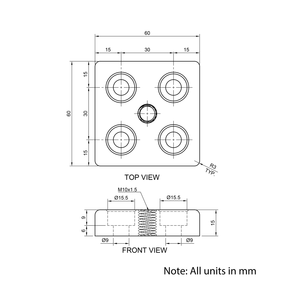 M10 60×60 30 Series Foot Plates are designed to mount directly onto the end of aluminium extrusion profiles, providing a central threaded hole for attaching levelling feet or other adjustable supports. Made from durable aluminium, these plates offer a reliable base for stability in various aluminium extrusion based assemblies. They are ideal for workstations, machine frames, and modular structures where adjustable height is required.