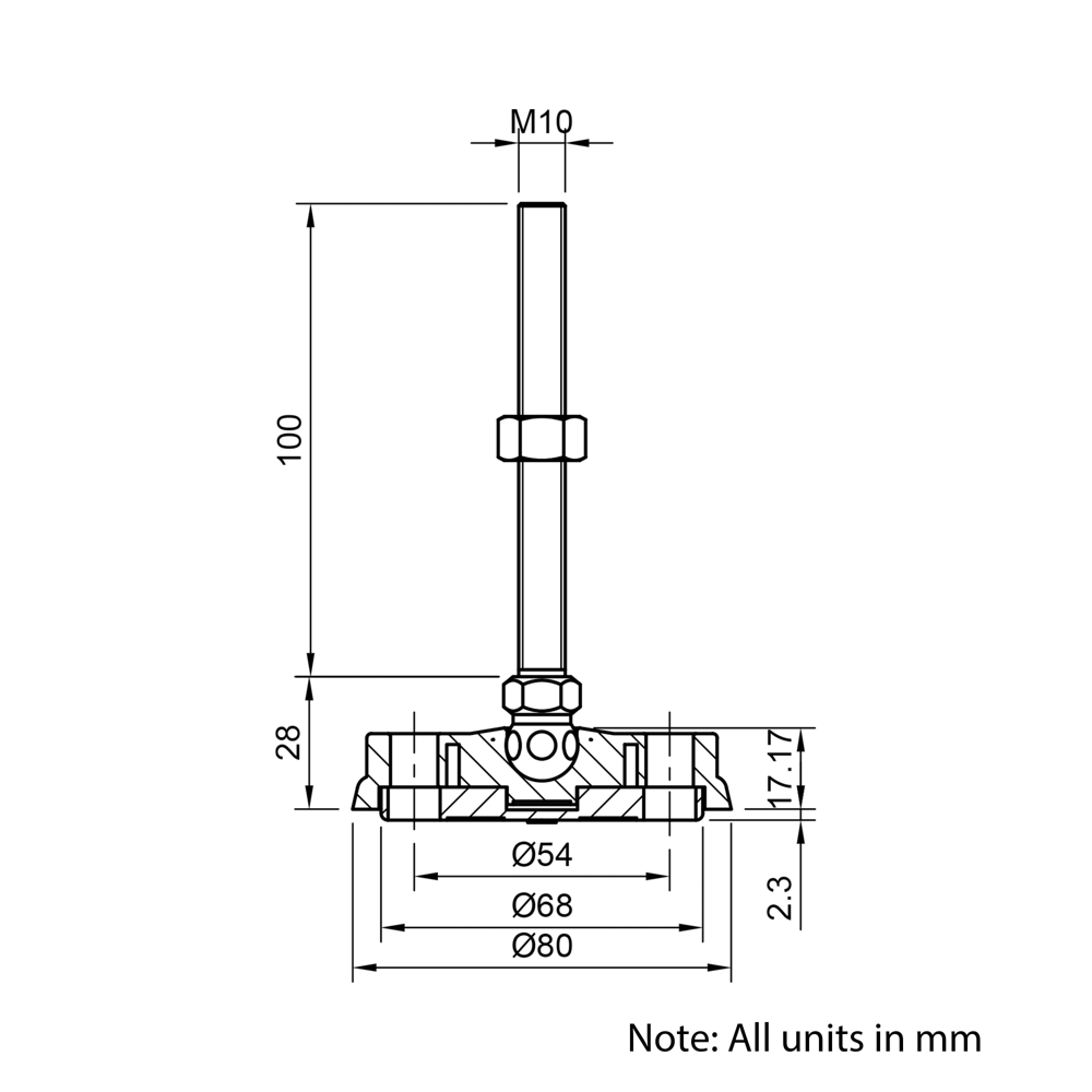 M10x100mm Nylon 80mm Articulating Anti-slip Levelling Foot is designed to provide adjustable and stable support for aluminium extrusion assemblies. It features an articulating threaded stud that allows for precise height adjustment and compensates for uneven surfaces. The durable nylon base includes a rubber anti-slip pad to enhance grip and prevent unwanted movement. Ideal for use with foot plates or edge plates, this levelling foot is a reliable solution for ensuring stability in a variety of projects.