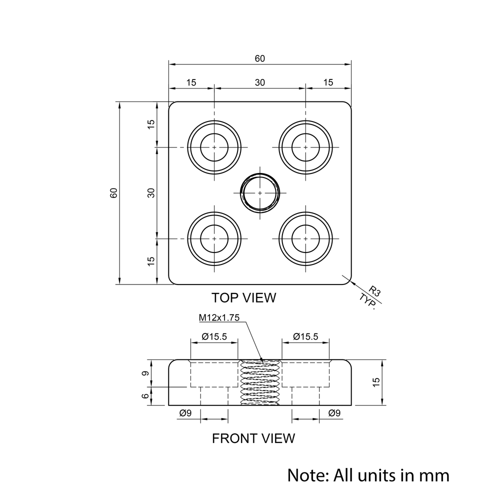 M12 60×60 30 Series Foot Plates are designed to mount directly onto the end of aluminium extrusion profiles, providing a central threaded hole for attaching levelling feet, castors, or other adjustable supports. Made from durable aluminium, these plates offer a reliable base for mobility and stability in various aluminium extrusion based assemblies. They are ideal for workstations, machine frames, and modular structures where adjustable height or mobility is required.