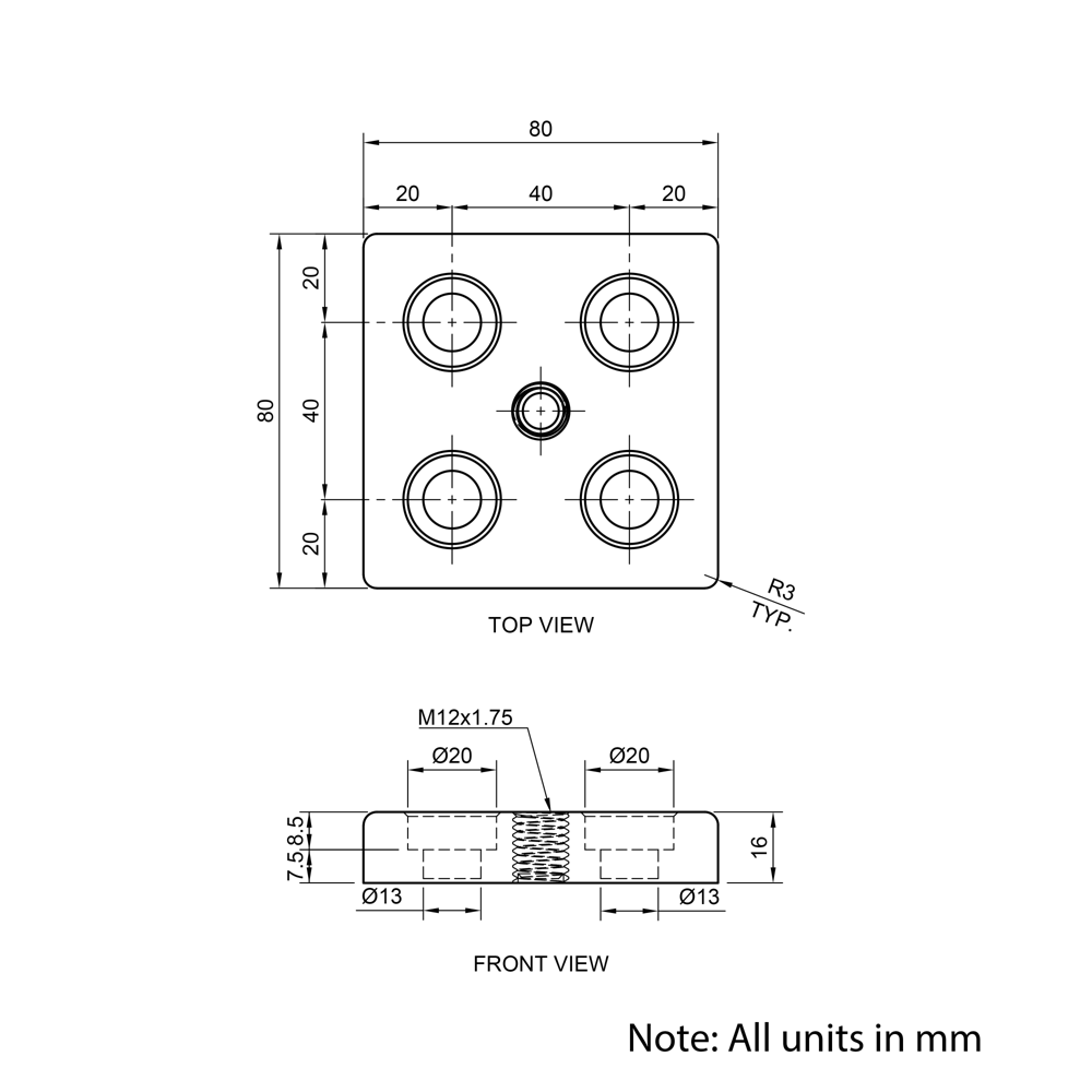 M12 80×80 40 Series Foot Plates are designed to mount directly onto the end of aluminium extrusion profiles, providing a central threaded hole for attaching levelling feet, castors, or other adjustable supports. Made from durable aluminium, these plates offer a reliable base for mobility and stability in various aluminium extrusion based assemblies. They are ideal for workstations, machine frames, and modular structures where adjustable height or mobility is required.