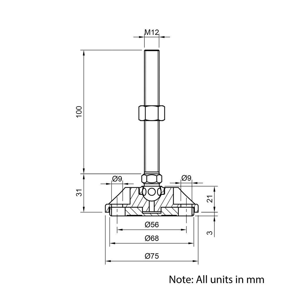 M12x100mm Metal 75mm Articulating Anti-slip Levelling Foot is designed to provide adjustable and stable support for aluminium extrusion assemblies. It features an articulating threaded stud that allows for precise height adjustment and compensates for uneven surfaces. The durable zinc base includes a rubber anti-slip pad to enhance grip and prevent unwanted movement. Ideal for use with foot plates or edge plates, this levelling foot is a reliable solution for ensuring stability in a variety of projects.