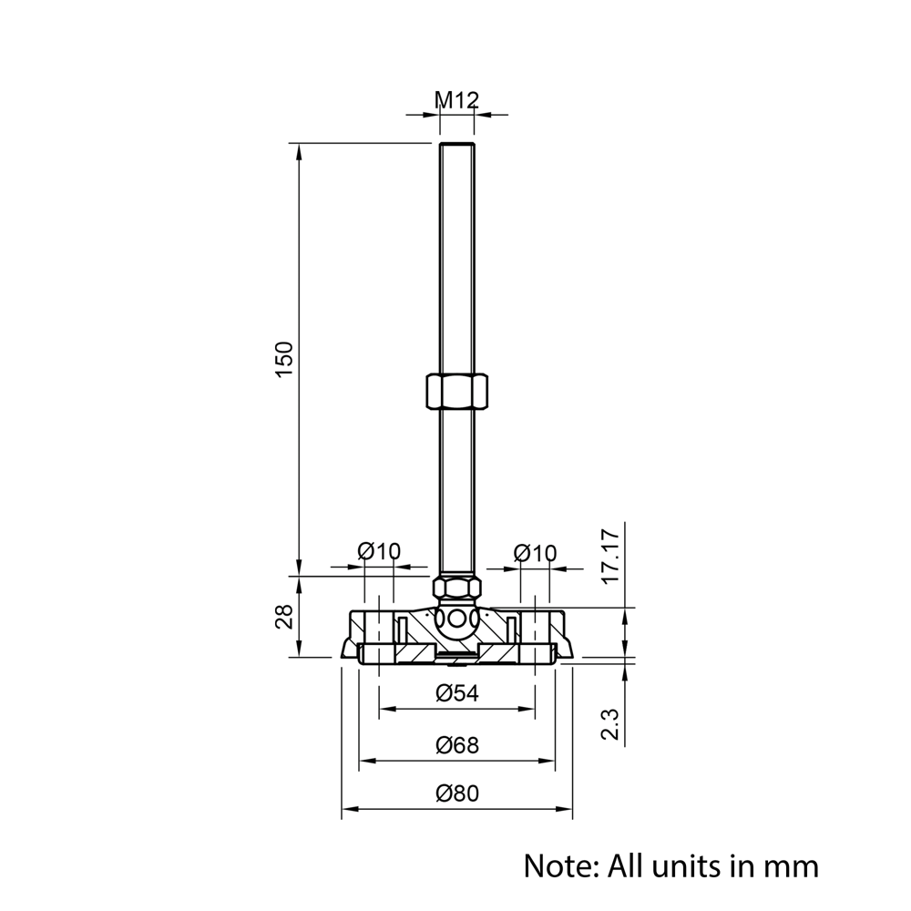M12x150mm Nylon 80mm Articulating Anti-slip Levelling Foot is designed to provide adjustable and stable support for aluminium extrusion assemblies. It features an articulating threaded stud that allows for precise height adjustment and compensates for uneven surfaces. The durable nylon base includes a rubber anti-slip pad to enhance grip and prevent unwanted movement. Ideal for use with foot plates or edge plates, this levelling foot is a reliable solution for ensuring stability in a variety of projects.