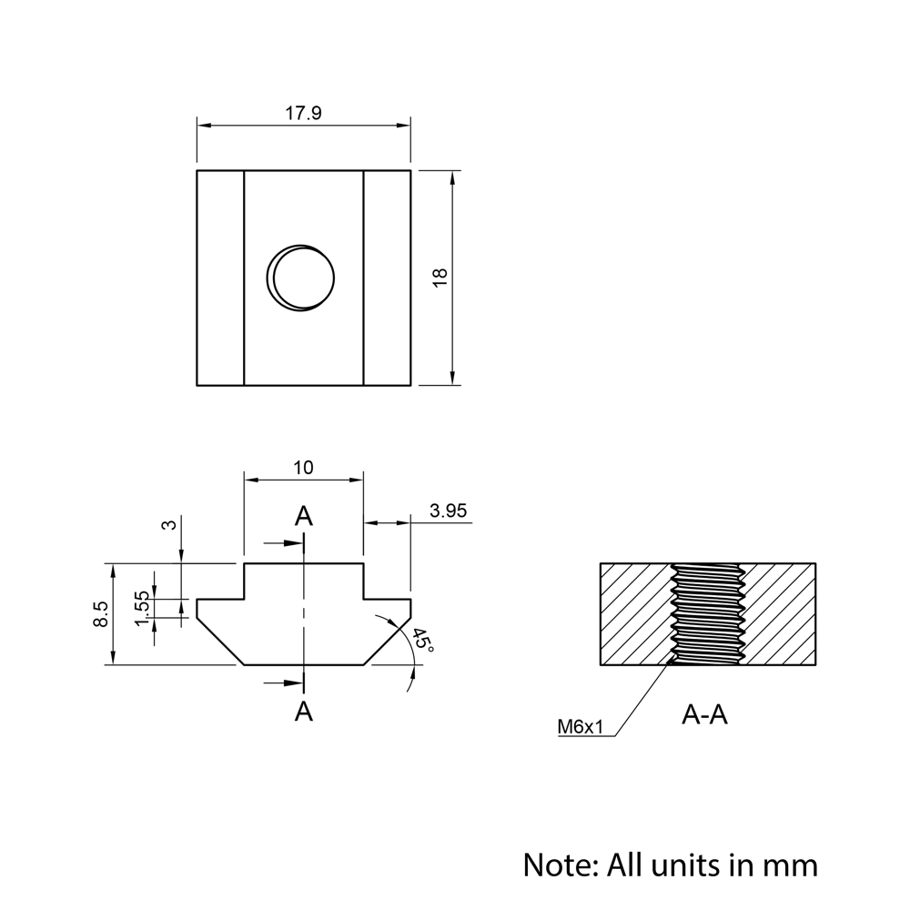 M6 40 & 45 Series T-Slot Roll In Nuts are a practical fastening solution designed for use with aluminium extrusion systems. These nuts can be inserted directly into the T-Slot from the face of the extrusion, making them convenient for modifications and adjustments without disassembling the frame. Zinc-plated for improved corrosion resistance, these nuts offer a balance of affordability and ease of use for a range of applications in modular framing and medium-duty assemblies.