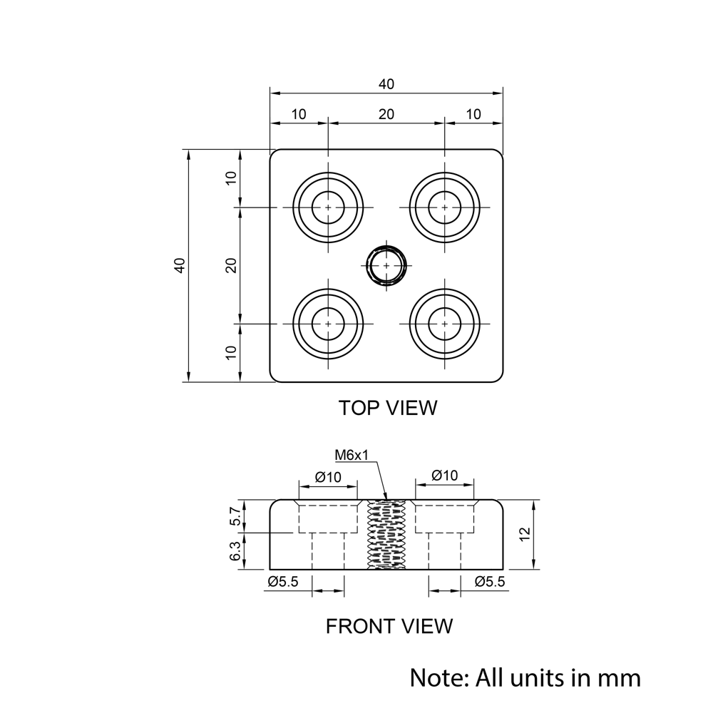 M6 40×40 20 Series Foot Plates are designed to mount directly onto the end of aluminium extrusion profiles, providing a central threaded hole for attaching levelling feet or other adjustable supports. Made from durable aluminium, these plates offer a reliable base for stability in various aluminium extrusion based assemblies. They are ideal for workstations, machine frames, and modular structures where adjustable height is required.
