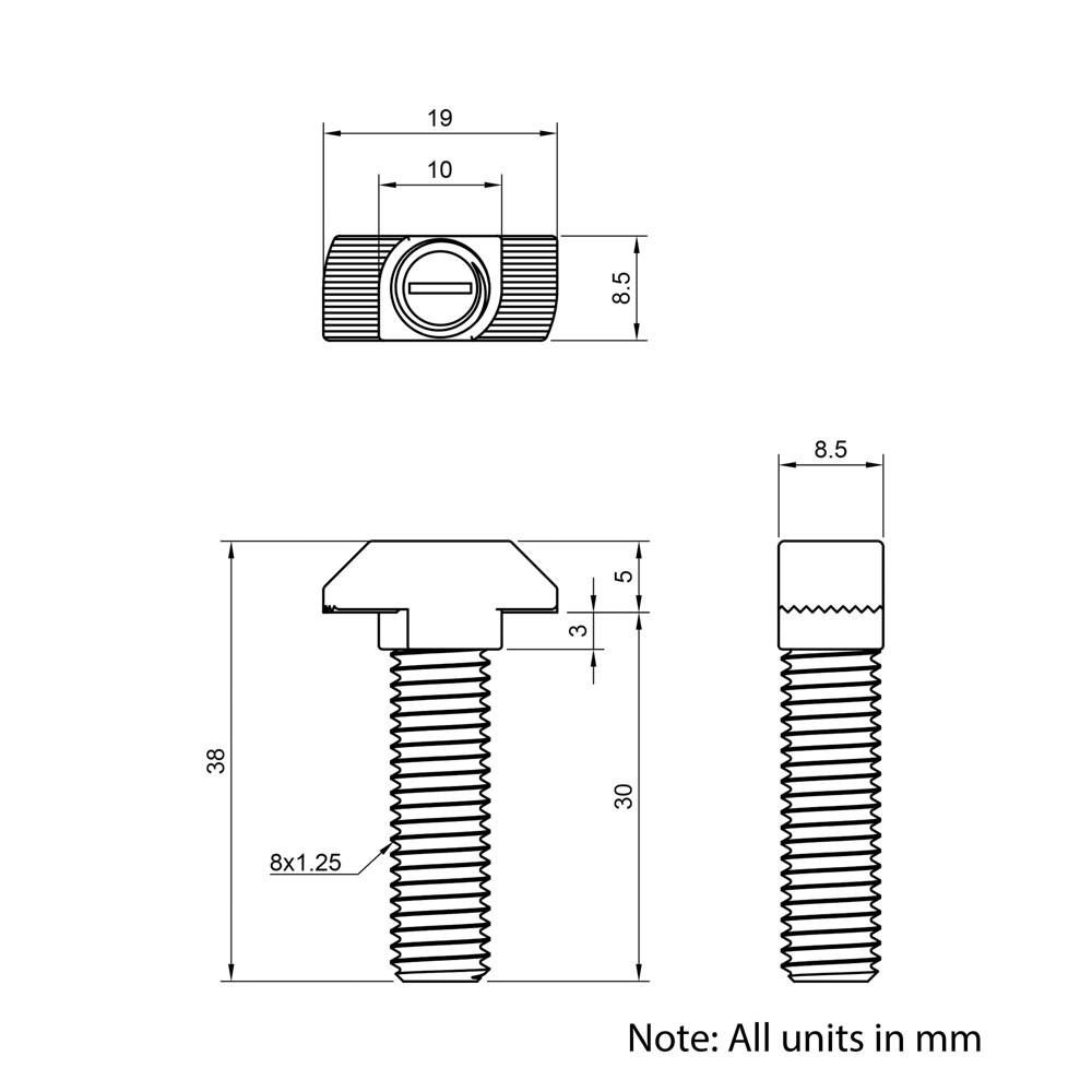 M8x30mm 40 & 45 Series T-Slot Drop In Bolts are a high-strength, reliable fastening solution designed for aluminium extrusion systems. Unlike Drop In Nuts, these bolts feature a built-in thread that works with a serrated flange nut to secure your accessory. The design allows for higher torque tightening using a spanner, providing a stronger, more secure connection. Additionally, the serrations on the flange of the nut offer resistance to loosening, especially in applications exposed to vibration. With face insertion, Drop In Bolts can be easily added or adjusted without disassembling the frame. Zinc-plated for corrosion resistance, these bolts are ideal for demanding applications requiring both strength and stability.