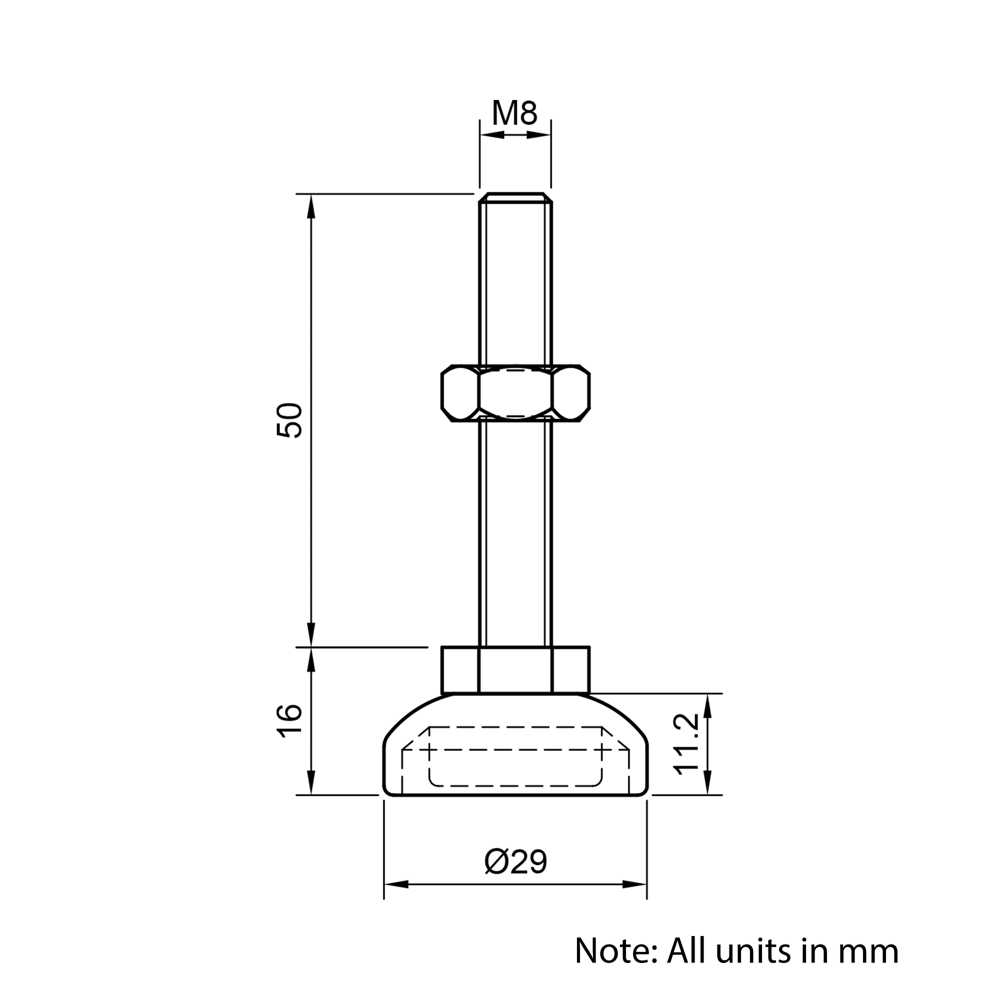M8x50mm Nylon 29mm Fixed Levelling Foot is designed to provide adjustable and stable support for aluminium extrusion assemblies. It features a fixed threaded stud that allows for precise height adjustment on flat surfaces. Ideal for use with foot plates or edge plates, this levelling foot is a reliable solution for ensuring stability in a variety of projects.