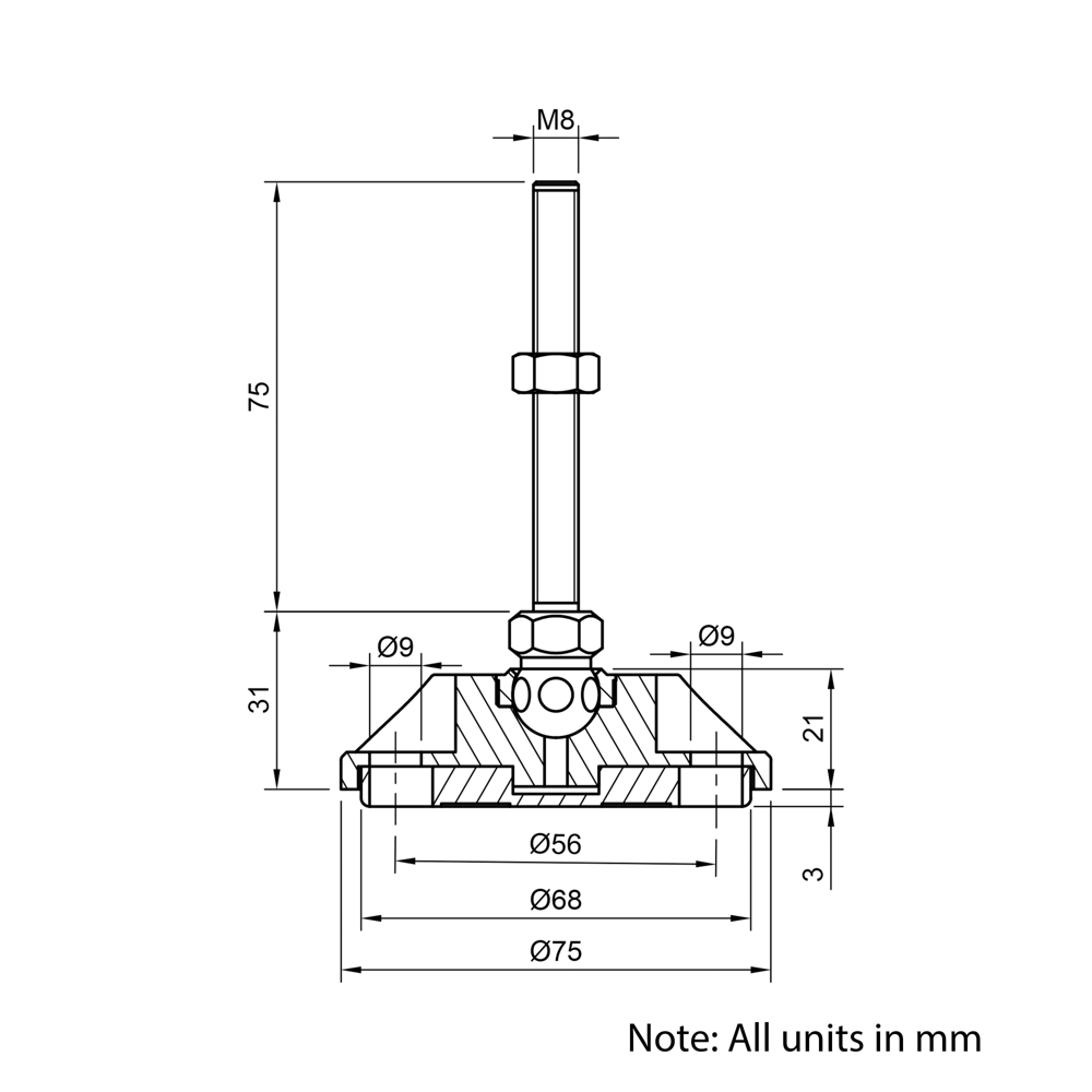 M8x75mm Metal 75mm Articulating Anti-slip Levelling Foot is designed to provide adjustable and stable support for aluminium extrusion assemblies. It features an articulating threaded stud that allows for precise height adjustment and compensates for uneven surfaces. The durable zinc base includes a rubber anti-slip pad to enhance grip and prevent unwanted movement. Ideal for use with foot plates or edge plates, this levelling foot is a reliable solution for ensuring stability in a variety of projects.