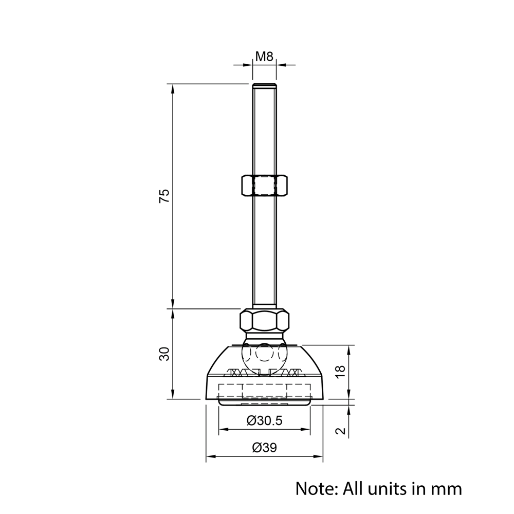 M8x75mm Nylon 39mm Articulating Anti-slip Levelling Foot is designed to provide adjustable and stable support for aluminium extrusion assemblies. It features an articulating threaded stud that allows for precise height adjustment and compensates for uneven surfaces. The durable nylon base includes a rubber anti-slip pad to enhance grip and prevent unwanted movement. Ideal for use with foot plates or edge plates, this levelling foot is a reliable solution for ensuring stability in a variety of projects.