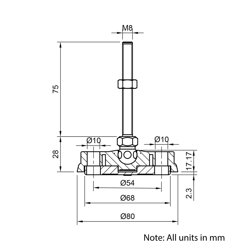 M8x75mm Nylon 80mm Articulating Anti-slip Levelling Foot is designed to provide adjustable and stable support for aluminium extrusion assemblies. It features an articulating threaded stud that allows for precise height adjustment and compensates for uneven surfaces. The durable nylon base includes a rubber anti-slip pad to enhance grip and prevent unwanted movement. Ideal for use with foot plates or edge plates, this levelling foot is a reliable solution for ensuring stability in a variety of projects.