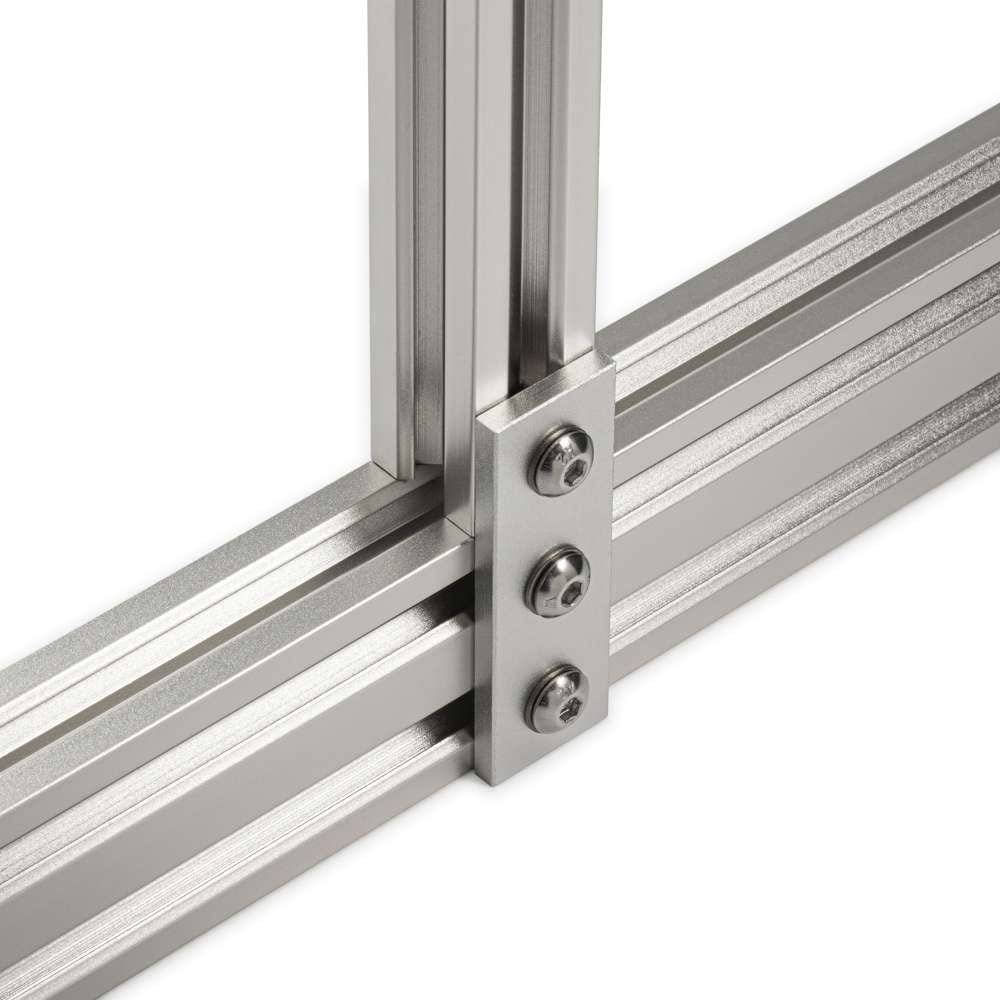 Plate Connectors for adjustable and strong aluminium extrusion assemblies.